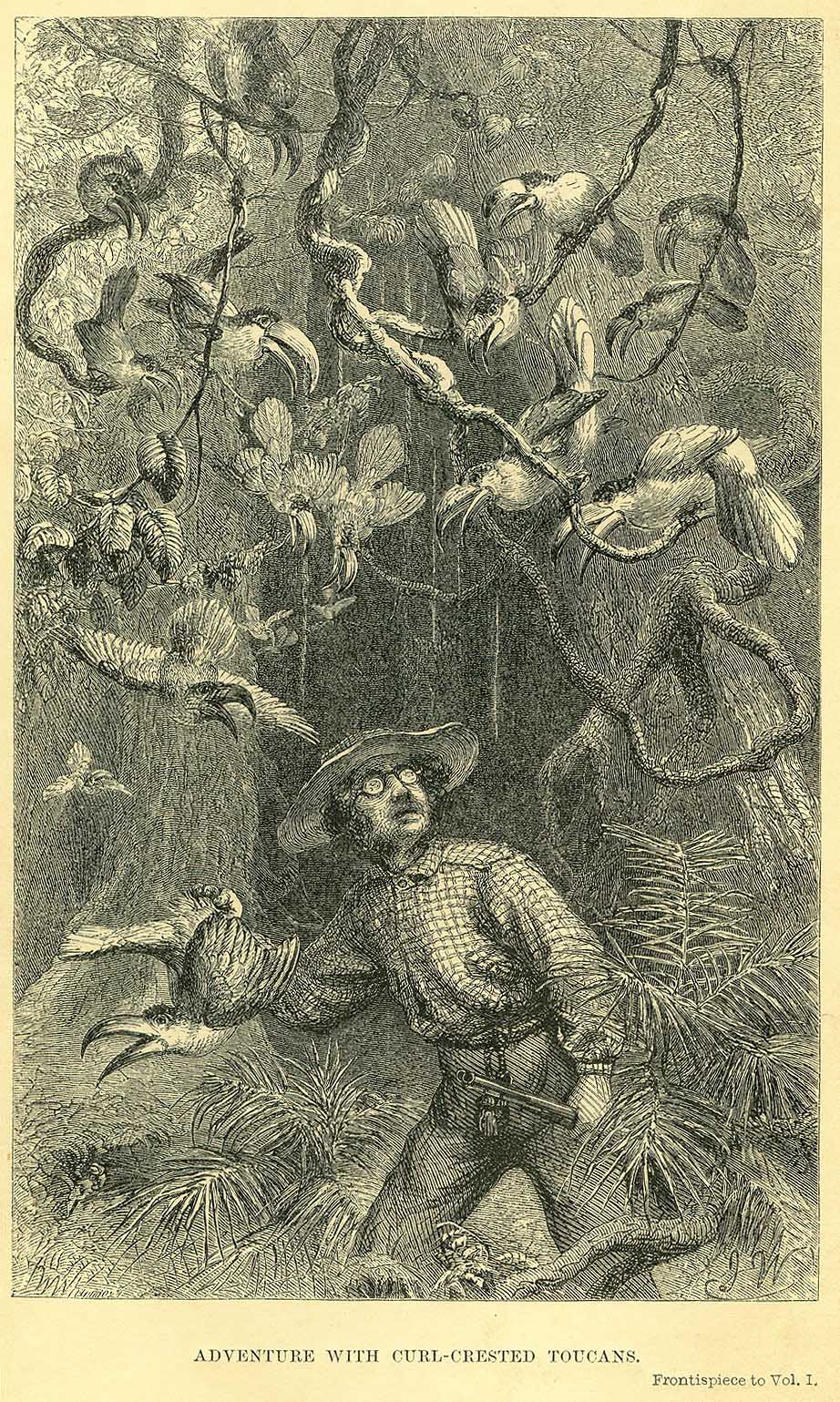 From H.W. Bates. 1863. The Naturalist on the River Amazons. (Now available online at Project Gutenberg. See also Bates (1863) On Heliconius). Vol II. p. 344: Adventure with Toucans "None of the Arrassarís, to my knowledge, make a yelping noise like that uttered by the larger Toucans (Ramphastos); the notes of the curl-crested species are very singular, resembling the croaking of frogs. I had an amusing adventure one day with these birds. I had shot one from a rather high tree in a dark glen in the forest, and leaving my gun leaning against a tree-trunk in the pathway, went into the thicket where the bird had fallen, to secure my booty. It was only wounded, and on my attempting to seize it, it set up a loud scream. In an instant, as if by magic, the shady nook seemed alive with these birds, although there was certainly none visible when I entered the thicket. They descended towards me, hopping from bough to bough, some of them swinging in the loops and cables of woody lianas, and all croaking and fluttering their wings like so many furies. Had I had a long stick in my hand I could have knocked several of them over. After killing the wounded one I rushed out to fetch my gun, but, the screaming of their companion having ceased, they remounted the trees, and before I could reload, every one of them had disappeared." Note: a version of this