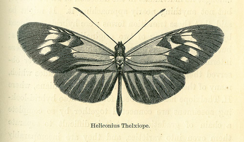 It is true that external agencies - such as food and climate, causing delayed or quickened growth, - have great effect on insects, acting on their adolescent states, and so by correlation of growth on the shape and colours of the adult forms.(2) But there is no proof that a complete local variety or race has been produce wholly by this means, modifications acquired by individuals not being generally transmissible to offspring. The examination of these races or closely allied species of Heliconii, with reference to their geographical distribution, throws light also on this subject. Thus Heliconius Thelxiope is disseminated over a district 2000 miles in length from east to west, from the mouth of the Amazons to the eastern slopes of the Andes, but shows no remarkable modification throughout all that area; some slight variations only occurring at extreme points of it. If local conditions [p. 263:] acting directly on individuals had originally produced this race or species, they certainly would have caused much modification of it in different parts of this region; for the upper Amazons country differs greatly from the district near the Atlantic in climate, sequence of seasons, soil, forest clothing, periodical inundations, and so forth. These differences moreover graduate away so that the species is subjected to a great diversity of physical conditions from locality to locality, and ought in consequence to present an endless series of local varieties, on the view mentioned, instead of one constant form throughout. Besides, how should we explain the fact of H. Thelxiope and H. Melpomene both existing under the same local conditions; and how account for the diversified modifications presented in one and the same locality as at Serpa and on the Tapajos?(3)