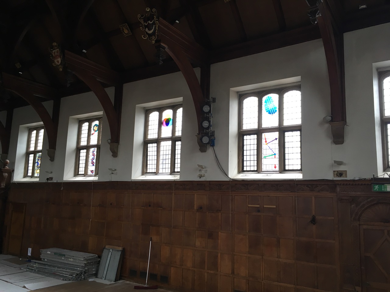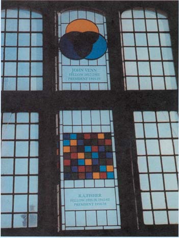 The photograph (left) shows the window in the Hall of Gonville and Caius College, Cambridge University, erected in Fisher's honour ca. 1990. Top left: a pane commemorating John Venn (and his Venn diagrams). Bottom left: a pane depicting Fisher's latin square experimental design. On 26 June 2020, Gonville & Caius College issued this statement "The College is now aware of the views and actions of R.A. Fisher [i.e. his support of the eugenics movement] ... The College Council was clear that it should no longer honour Fisher the man with a window, which causes such broad offence." By 29 July 2020 the Fisher window (or "roundel") had been removed (right). |